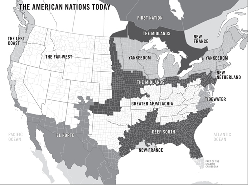 The basic premise of Woodward’s book is the country is really 11 nations — each with distinctive cultural, political and religous beliefs. Of course, I — like many — grew up learning the traditional story of American history. In this historical accounting, the eastern colonies fought for independence and then marched westward to conquer the land from ‘sea to shining sea.’