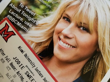 I’m too old to have ‘been raised on’ Full House so I have not watched Fuller House either, but after listening to actress Jodie Sweetin’s speech at Miami University in Oxford, Ohio Monday evening, Oct 30, I was impressed with her humanity.