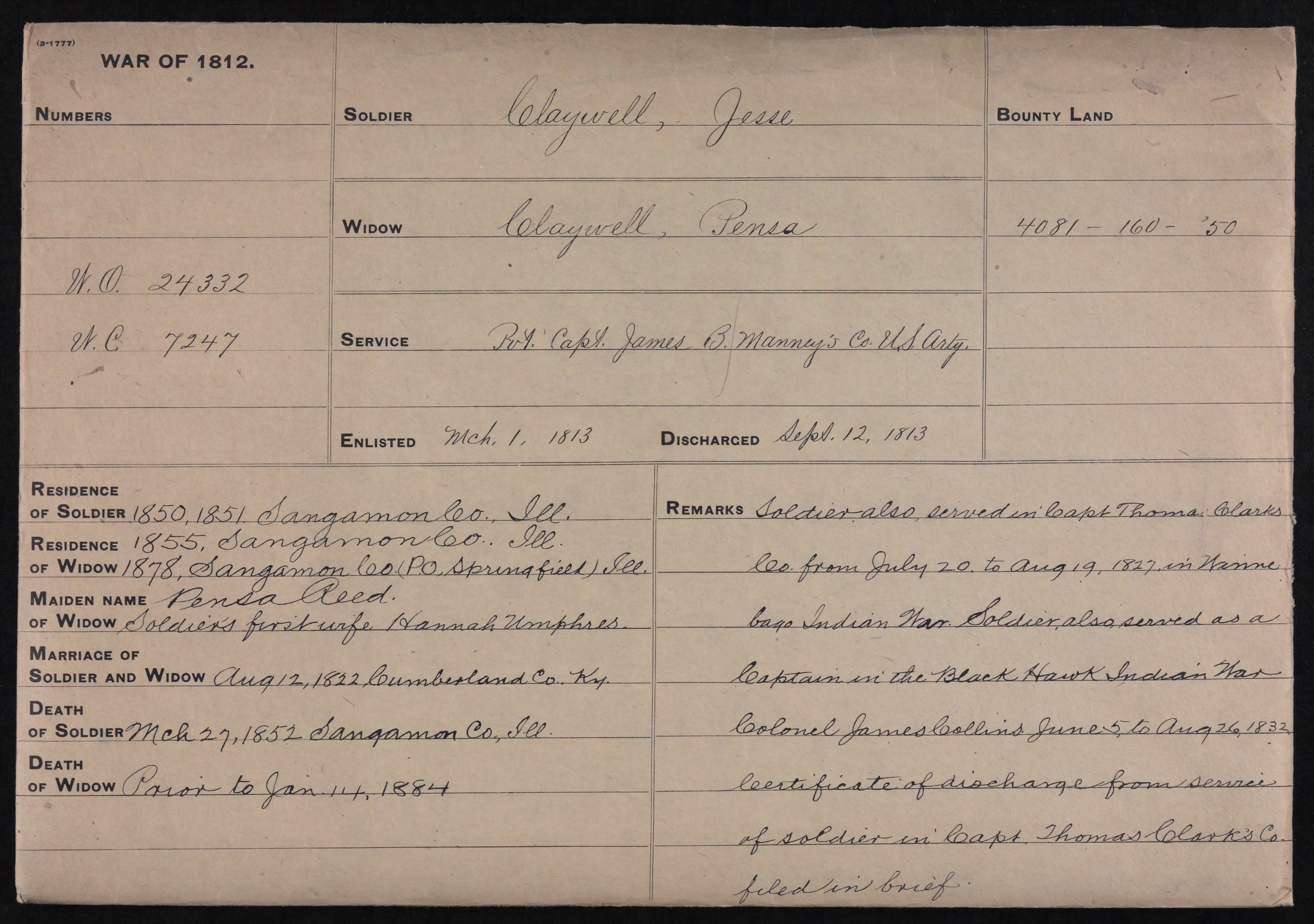 Jesse served in three wars during his life: The War of 1812, The 1827 Winnebago Indian War and the 1832 Black Hawk War. The years he served, though, are sketchy at times, because some of his records were lost. What is known is Jesse enlisted at Burkeville, Ky. during the War of 1812 at the age of 17/18 and he was discharged in New Orleans on September 12, 1813. During this enlistment period he joined as a private and was honorably discharged in New Orleans with the rank of corporal. He served in both the light artillery unit (under Lieutenant Samuel Price) and in the heavy artillery unit.